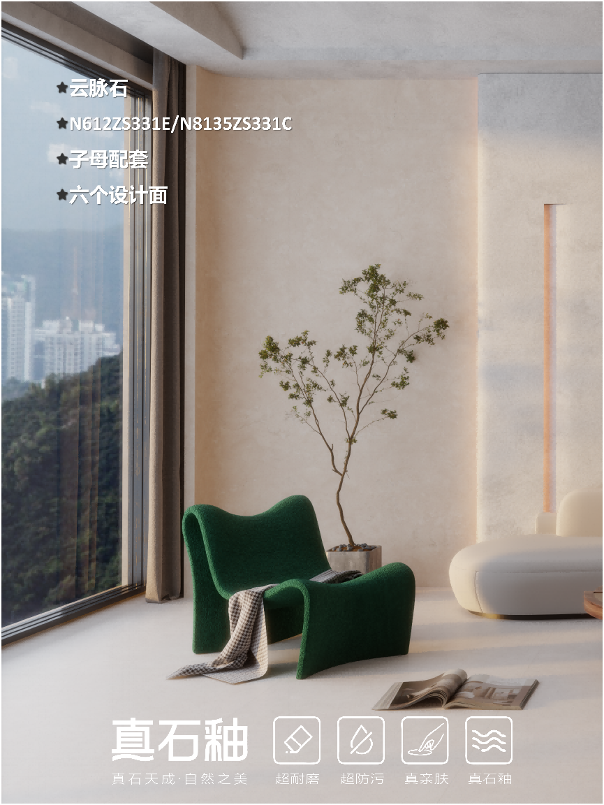 N612ZS331E/N8135ZS331C 云脉石,以真石釉复合工艺为笔,将山川蕴育的云气脉络,凝于方寸瓷面,复刻原生肌理的温润与哑光质感,让自然之美,悄然浸润家居每一处角落。