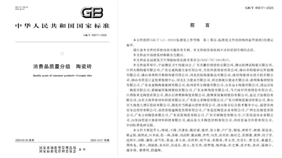 中国陶瓷行业迎来历史性时刻!GB/T 45817-2025《消费品质量分级 陶瓷砖》国家标准将于2025年12月1日正式实施,该标准首次建立行业分级体系,将产品分为AAAAA(5A)、AAAA(4A)、AAA(3A)三个等级。这场行业的质量"大考",为优秀企业提供了展示实力的舞台。