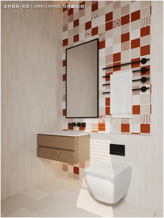 每一小格的图案都像精心设计过的版画,几何线条、抽象波纹与点状肌理交错,拼贴出独特复古摩登感。用在浴室柜背景墙、淋浴区或马桶后墙,都能立刻成为空间的焦点,温暖又不失格调。