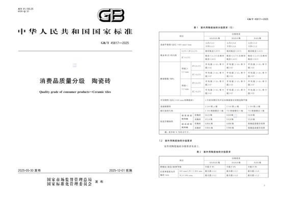 2025年9月,国家标准化管理委员会正式发布GB/T 45817-2025《消费品质量分级 陶瓷砖》国家标准,并明确该标准将于2025年12月起正式实施,陶瓷砖行业迎来了历史性变革。
