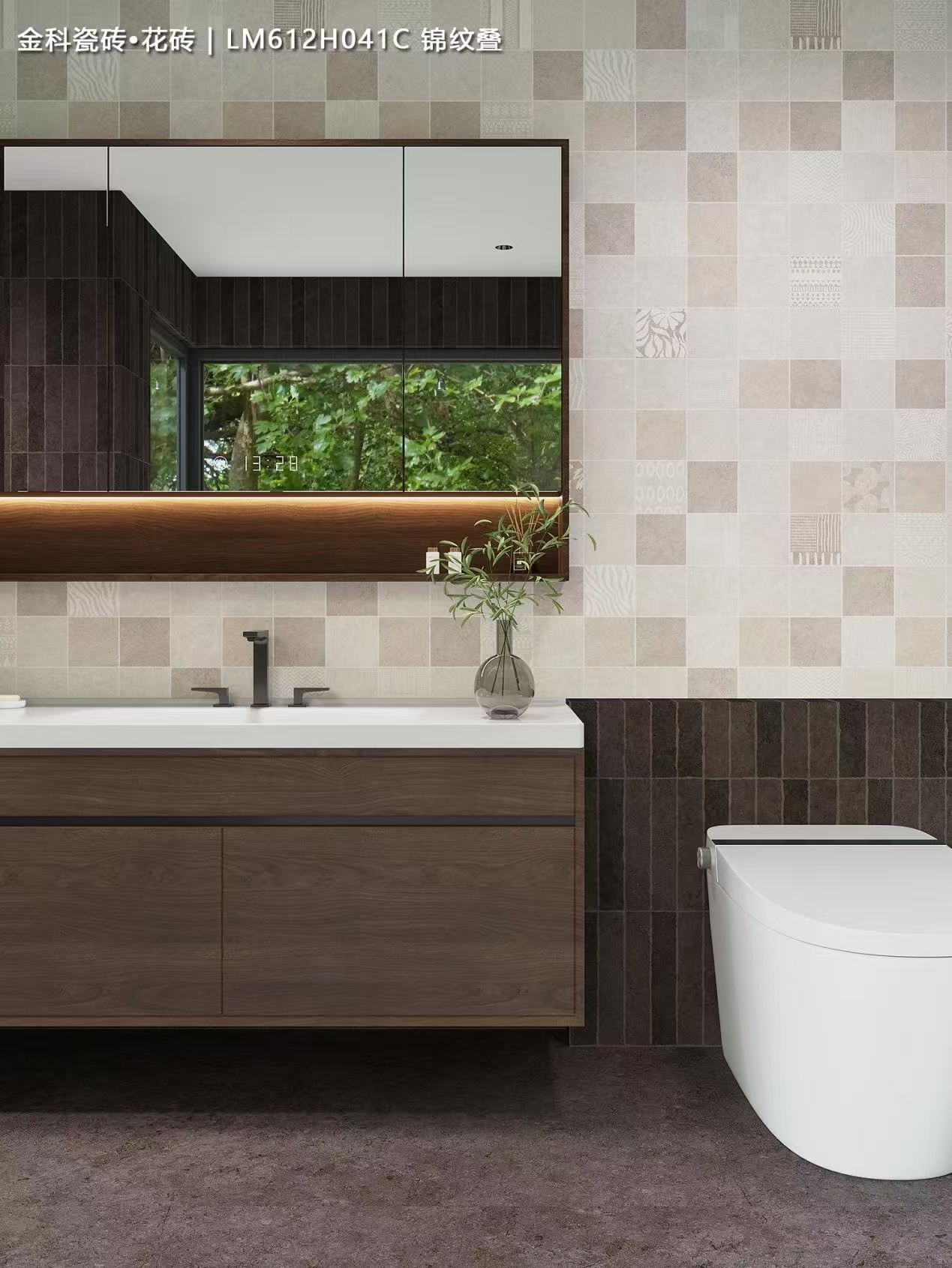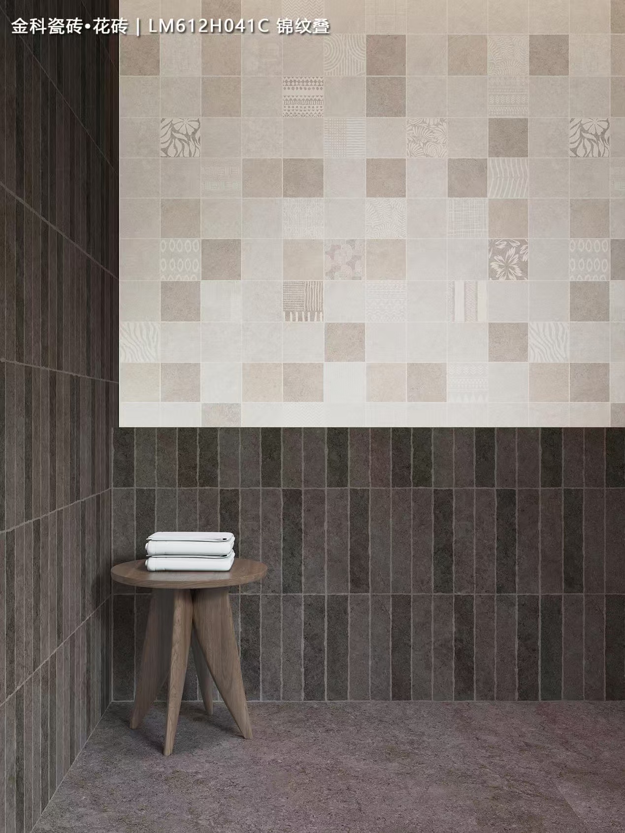 初见就被它的纹路吸引住了!它由无数个大地色系的小方块拼接而成,每个方块内都雕琢着独特的几何线条、植物纹样或抽象符号,如同精心收集的化石与琥珀,深浅交错。铺贴后,这些浮雕般的图案在哑光釉面下交织,形成一幅复古、精致且充满层次感的艺术拼图,让墙面瞬间拥有时光沉淀的故事感。